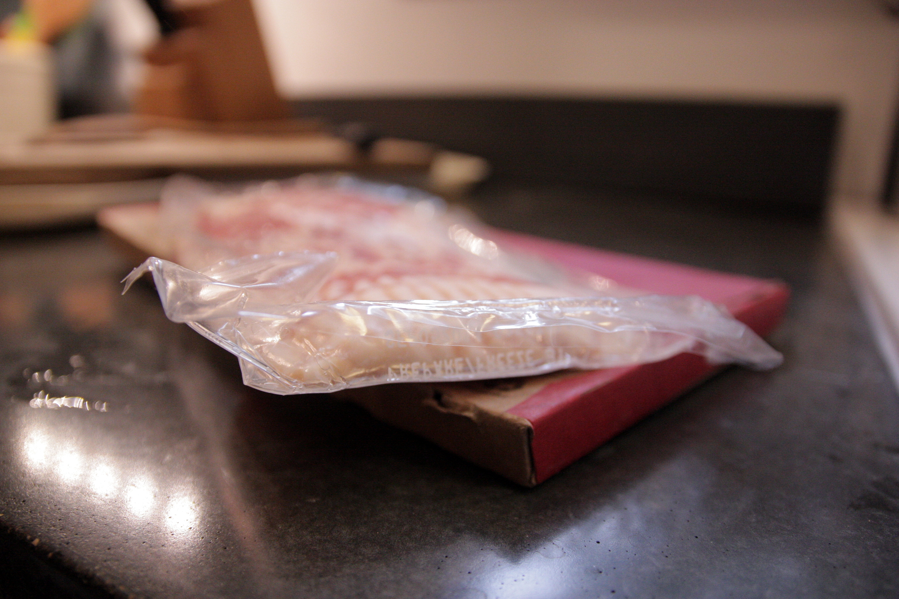 Next, open your package of bacon and line those pink piggies up along the pan.